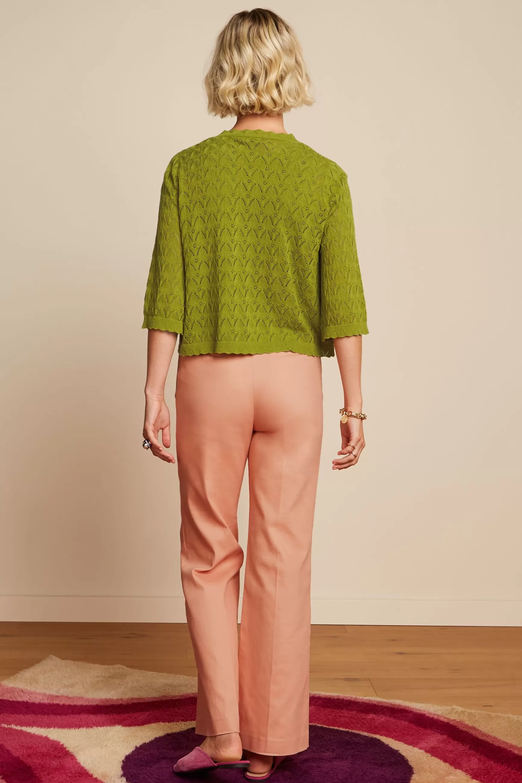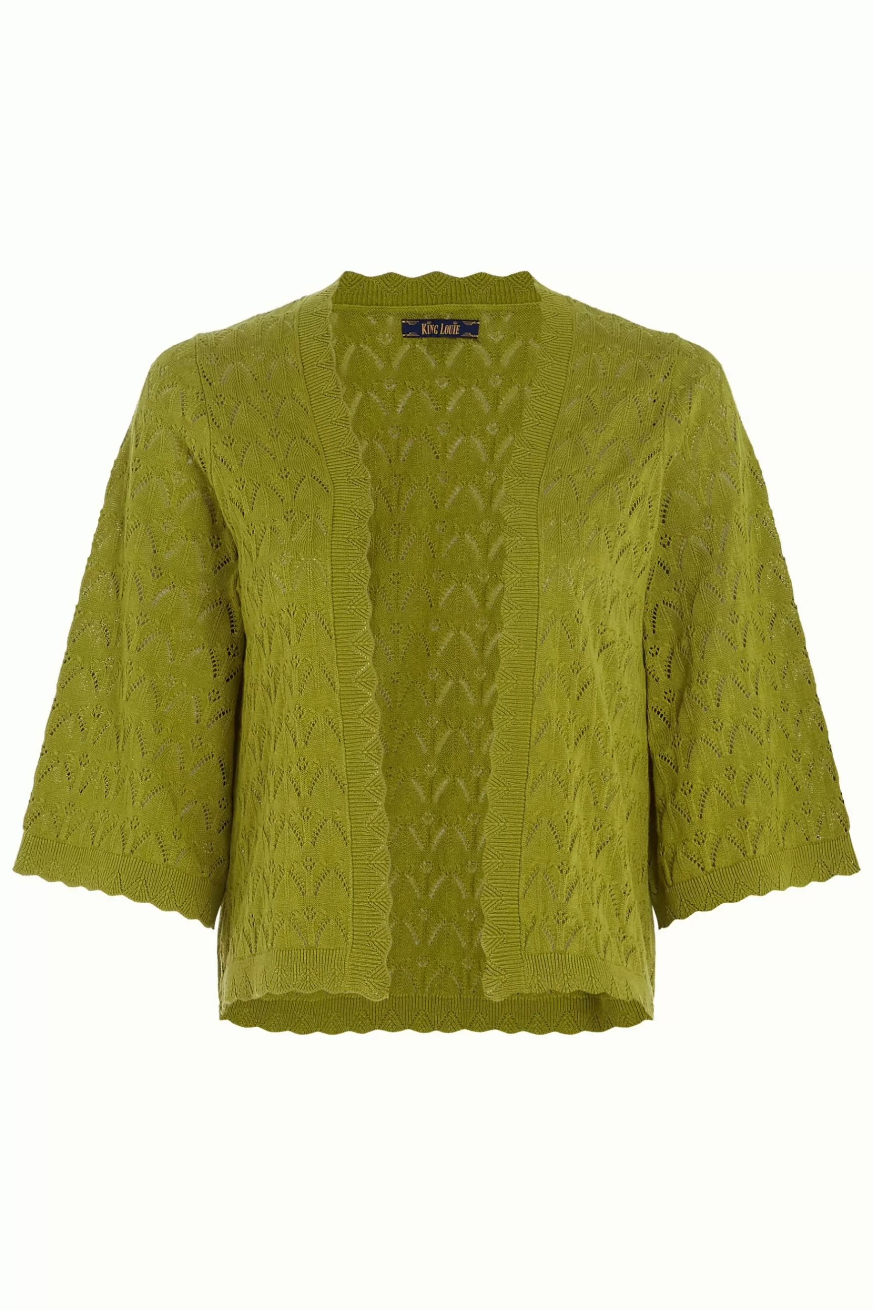 Product details Gebreid vestKimono stijlAfgewerkt met schulprandjesHalve mouwenStretchAjour breisel productspecificatie…