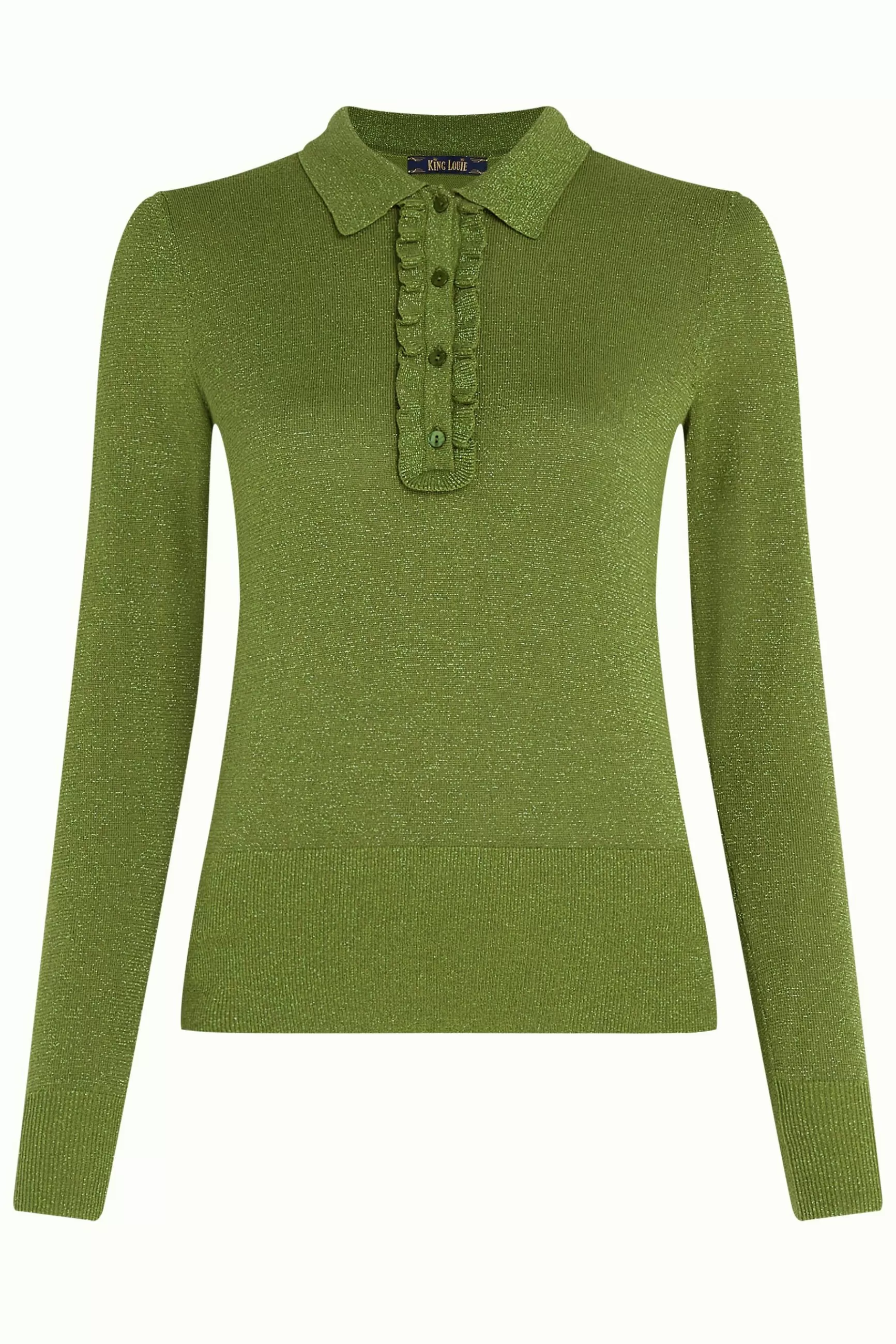 Product details Glitter poloLange mouwenKnoopsluitingRuches langs de knooplijstGebreidStretch productspecificatiesGemaa…