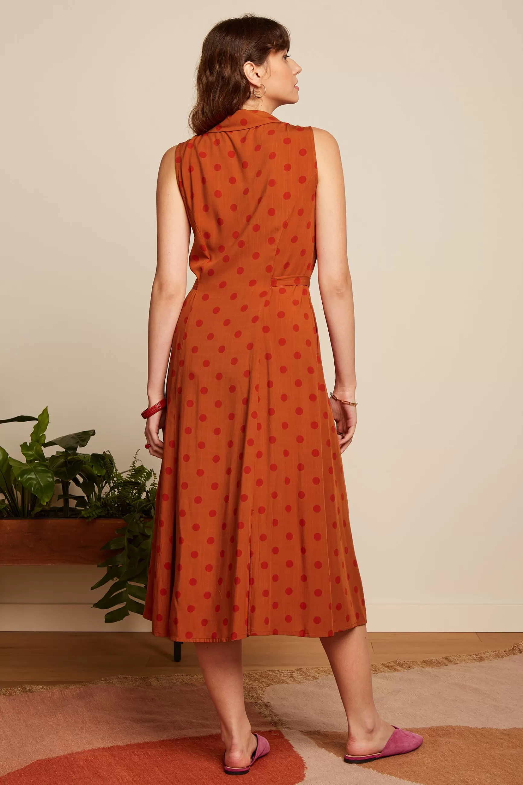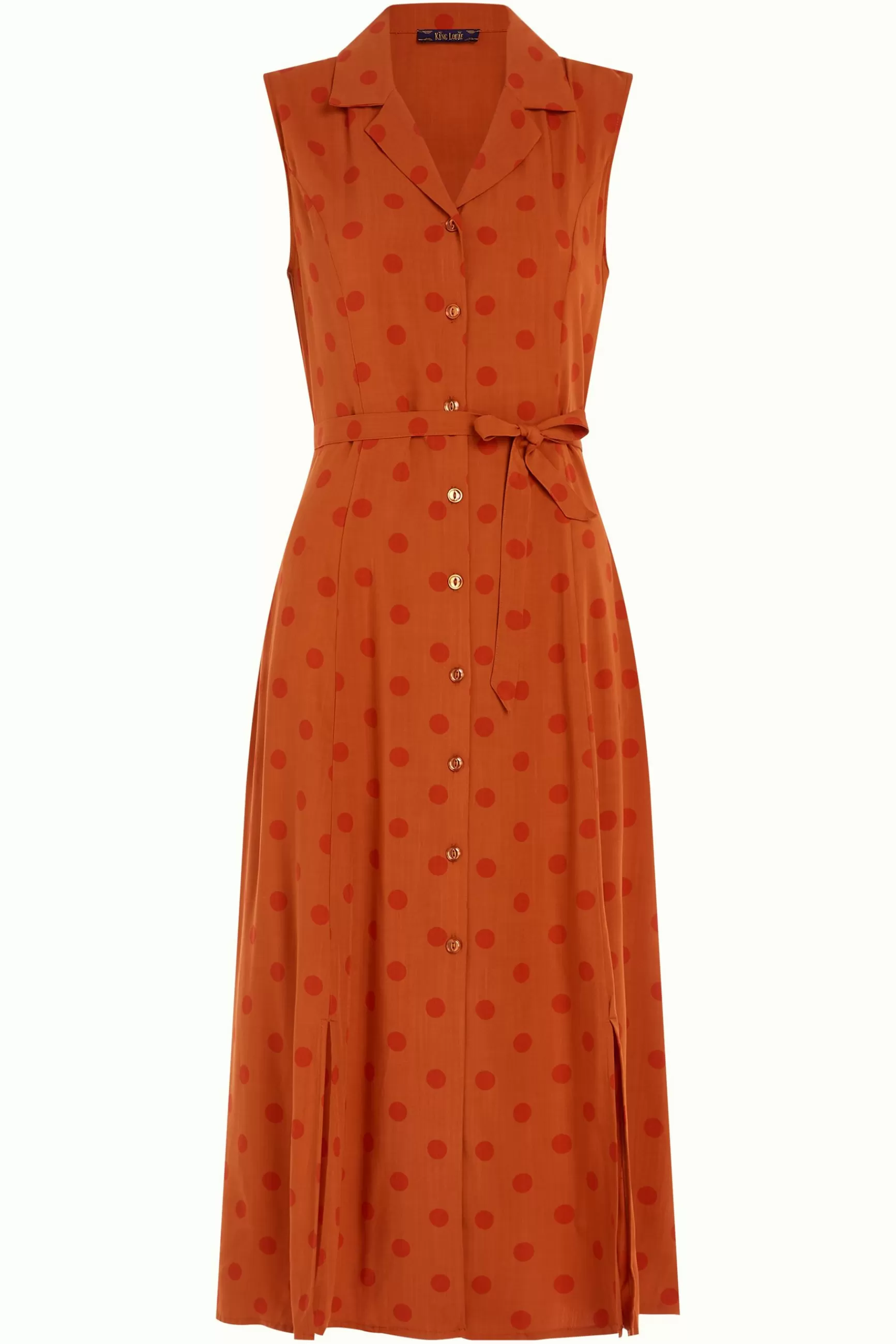 Product details Mouwloze jurkReverskraagDoorknoopsluitingSplitjes aan de voor- en achterkantGewevenNon stretchStippenpr…